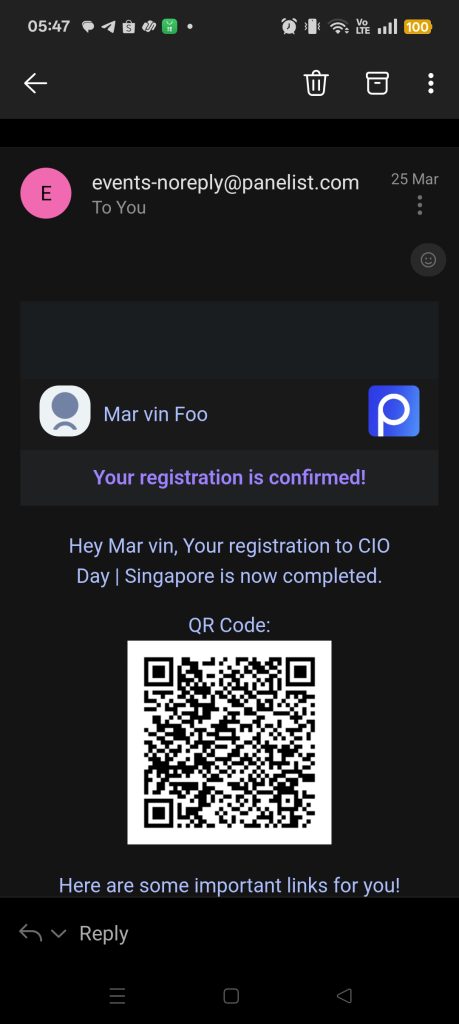 I had received a confirmed registration email on 25 March 2025, complete with a valid QR code (see screenshot). As a professional who values meaningful dialogue and forward-looking leadership, I made time to attend — only to be stopped at the door.