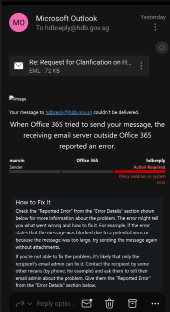 • HFE rejection without recourse: Another reader’s HFE (Home Financing Eligibility) application was rejected even though the hotline said his documents were fine. No explanation, no link to appeal, no channel to give feedback. A Family Service Centre officer finally drafted an email on his behalf; but when the reader replied to the HDB address (copied in), the message bounced. For a family urgently needing a home, this is not a minor UX bug; it’s a wall.