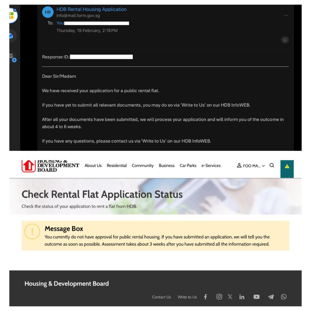 - 一名申请公共租赁组屋的读者收到确认邮件,但在HDB门户系统中找不到可用于追踪的正式申请记录编号。